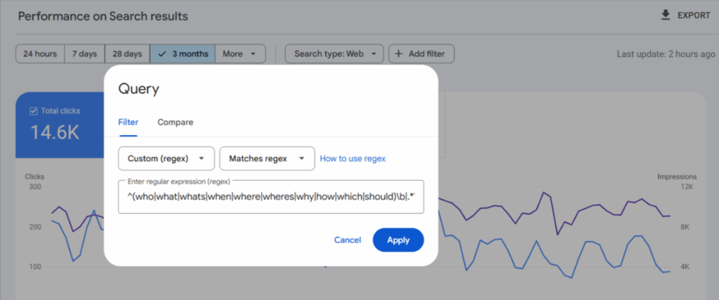Chances are, when the regex is applied the report will show a similar number of impressions, but lower clicks. Check whether those queries now trigger an AI Overview. And if so review, what AI Overviews are saying. Is your brand mentioned? Is it favourable? Is it aligned with your brand’s messaging?