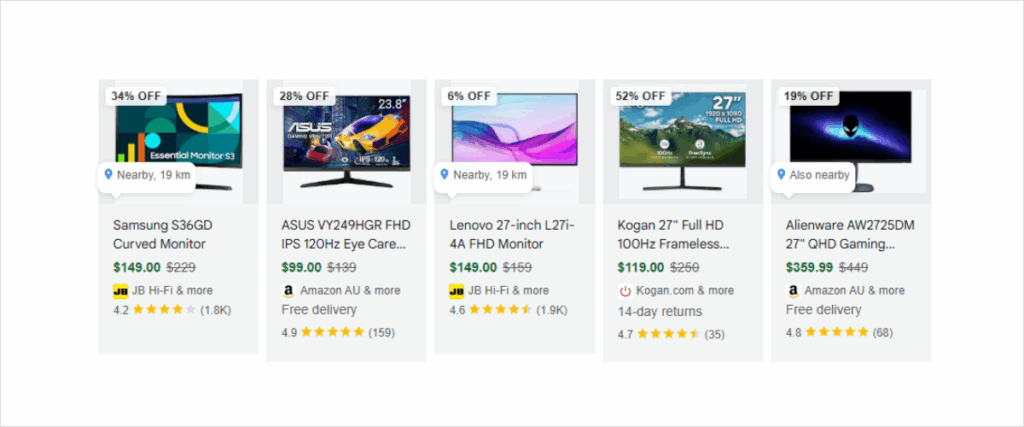 Google’s eCommerce results span far beyond traditional listings. Your products may now appear in Shopping carousels, People Also Ask (PAA), brand knowledge panels, ‘products nearby’, and even visual search. These SERP surfaces offer significant visibility, but only if your data is structured and rich enough to be pulled into them.